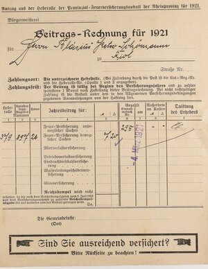 Eine Rechnung der Gemeindekasse Riol-Longuich vom 10. Juli 1919 an Peter Bläsius. Laut dem Schreiben schuldet Bläsius der Gemeinde insgesamt 116,55 Reichsmark für drei Ladungen Holz. Das Geld soll er der Gemeinde auf ein Postscheckkonto in Köln überweisen.