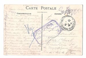 Die Postkarte zeigt das Rathaus von Marseille. In einem kleinen Hafen liegen kleinen Segel- und Ruderboote vor Anker. In der Bildmitte wird ein Boot von zwei Personen gerudert. Die Karte wurde an dem Kriegsgefangenen Karl Simon versandt. Neben den üblichen Grüßen an die Familie sieht man auf der Rückseite die Buchstaben "Vu", was auf deutsch "gesehen" bedeutet. Dies ist ein Beleg für Zensur in den Lagern.