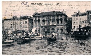 Die Postkarte zeigt das Rathaus von Marseille. In einem kleinen Hafen liegen kleinen Segel- und Ruderboote vor Anker. In der Bildmitte wird ein Boot von zwei Personen gerudert. Die Karte wurde an dem Kriegsgefangenen Karl Simon versandt. Neben den üblichen Grüßen an die Familie sieht man auf der Rückseite die Buchstaben "Vu", was auf deutsch "gesehen" bedeutet. Dies ist ein Beleg für Zensur in den Lagern.