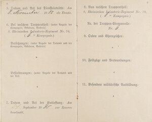 Diesem Militärpass ist zu entnehmen, dass Peter Bläsius, geboren am 19. September 1860 in Riol, am 8. November 1882 als Ersatz-Musketier dem 8. Rheinischen Infanterie-Regiment Nr. 70 beigetreten war. Am 21 September 1885 wurde er als Reservist entlassen. Am 18. Februar 1887 wurde er jedoch noch einmal zu einer 12-tägigen Wehrübung eingezogen. Ansonsten scheint er während seiner Dienstzeit an keinen Feldzügen oder ähnlichem teilgenommen zu haben.