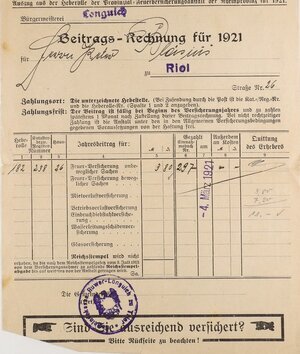 Zwei Beitragsrechnungen der Provinzial-Feuerversicherungsanstalt der Rheinprovinzen in Düsseldorf an Peter Bläsius aus Riol. Laut den beiden Schreiben vom 4. März 1921 musste Bläsius für im Jahr 1921an die Versicherung insgesamt 3,80 RM für unbewegliche und 7,20 RM für bewegliche Sachen zahlen.