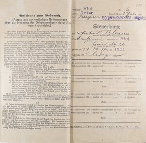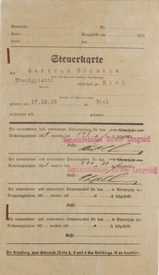 Steuerkarte der am 17. Oktober 1903 in Riol geborenen Gertrud Bläsius. Dieses Steuerkarte wurde am 9. Juli 1920 vom Bürgermeisteramt Longuich für die damals 16-Jährige ausgestellt. Darin ist vermerkt, dass sie als Stenotypistin tätig war und in den Jahren 1920 und 1921 in die Gemeindekasse Ruwer-Longuich einzahlte.