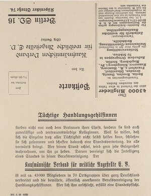 Nicht ausgefüllte Beitrittserklärung zum Kaufmännischen Verband für weibliche Angestellte. Dieser Verein hatte in den 1910.er Jahren ca. 43.000 Mitglieder in 70 Ortsgruppen. Der vierteljährliche Beitrag betrug für unter 18-jährige 1,50 RM, für 18-jährige 2,55 RM und für über 18-jährige 3,75 RM. Die Mitglieder genossen dafür Stellenlosen-Unterstüzung, Stellenvermittlung und Rechtshilfe.