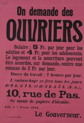 Wandanschlag in französischer und deutscher Sprache Herausgegeben im von Deutschland besetzten Frankreich; Lille, den 6. März 1916. "Bekanntmachung. Auf Antrag der Buergermeisterei werden bis auf Weiteres folgende Hoechstpreise fuer den Kleinverkauf festgesetzt: Kaffee ................. 5 fr. 50 für 1 kg Zichorie ............... 0 fr. 80 " " Zucker, kristall ..... 2 fr. 30 " " " in Würfeln 2 fr. 50 " " Salz .................... 0 fr. 10 " " Chokolade ........... 5 fr. 50 " " Kakao in Pulver ... 7 fr. 50 " " Konfitüren ........... 2 fr. 25 " " Kaese ................. 6 francs " " Feigen ................. 2 francs " " Makaroni, Nudeln . 4 francs " " Schinken i. Schnitt 9 francs " " Frische Butter ..... 12 francs " " Speiseoel ........... 9 francs für 1 Liter Kondens. Milch .... 1 fr. 50 " 1 Dose Eier .................... 0 fr. 35 " 1 Stck Hering, geraeuchert 0 fr. 35 " " Houblonnette ...... 31 francs 1 Fass von 160 Liter Kartoffeln ........... 0 fr. 30 für 1 kg Gelbe Rüben ....... 0 fr. 40 " " Steckrüben ......... 0 fr. 35 " " Porree ................ 1 fr. 25 " 1 Bund Bohnen, getrocknet 1 fr. 50 " 1 Liter Zwiebel .............. 0 fr. 50 " 1 kg Schmierseife ....... 2 fr. 50 " " Überschreitungen der Hoechstpreise werden nach den Bekanntmachungen im Bulletin de Lille Nr. 62, 68, 99, 103 u. 135 vom 17. Juni 1915, 8. Juli 1915, 24. Oktober 1915, 7. November 1915 und 27. Februar 1916 bestraft. Die gleiche Strafe trifft kuenftig Kaufleute und Haendler, die Lebensmittel verborgen halten, um sie dem Verkaufe zu entziehen."