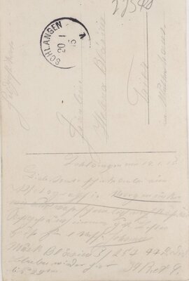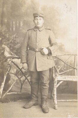Ein junger Soldat posiert vor einer Studiokulisse mit einer Bank und einem Zaun aus Birkenholz im Hintergrund. Er hält lässig eine brennende Zigarette in der Hand und seine Stiefel sind lehmverschmiert. Der Absender dieser Postkarte ist Mathias Bläsius aus Schlangen. Das Foto schickte er am 20. Januar 1915 als Postkarte an Fräulein Helena Bläsius in Trier. Der Text ist nicht zu entziffern.