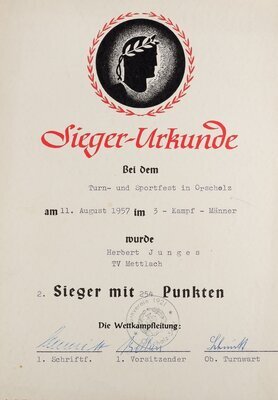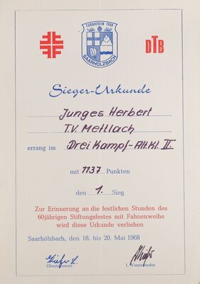 Diese Urkunde wurde beim Gauturnfest am 27. und 28. Juli 1957 in Ensdorf an Herbert Junges aus Mettlach verliehen. Mit insgesamt 250,00 Punkten im 3-Kampf der Tu VI Unterstufe wurde Junges als 1.Sieger ausgezeichnet. Die Urkunde wurde vom Gau-Vorsitzenden und vom Vereins-Vorsitzenden unterschrieben.