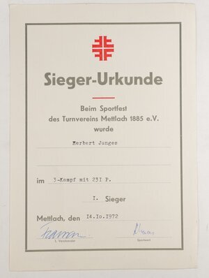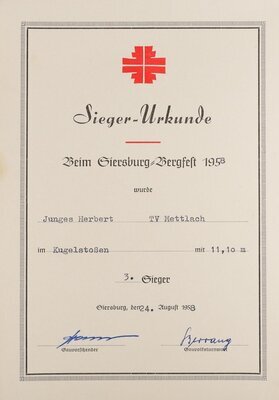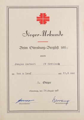 Diese Urkunde wurde bei den Gruppen-Meisterschaften in Dillingen am 23. Juni 1957 an Herbert Junges aus Mettlach verliehen. Mit 12,05 sec beim 100m-Lauf wurde Junges mit dem 5.Platz ausgezeichnet. Die Urkunde wurde vom Kampfrichter und vom Gruppenleiter unterschrieben.