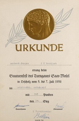 Diese Urkunde wurde beim Gauturnfest vom 5. bis zum 7. Juli 1958 in Orscholz an Herbert Junges aus Mettlach verliehen. Mit 350 Punkten beim Fünfkampf wurde Junges mit dem 16.Sieg ausgezeichnet. Die Urkunde wurde vom Gauvorsitzendem, dem 1.Vorsitzendem und vom Oberturnwart unterschrieben.