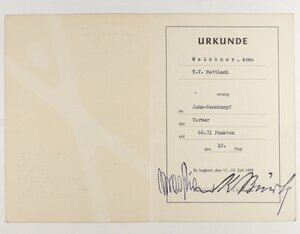 Diese Urkunde wurde beim Landes-Turnfest vom 17. bis zum 19. Juli 1959 in St.Ingbert an Arno Weichner aus Mettlach verliehen. Mit 66,71 Punkten beim Neunkampf wurde Weichner mit dem 10.Platz ausgezeichnet. Die Urkunde wurde vom 1.Vorsitzendem und vom Oberturnwart unterschrieben.