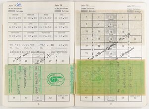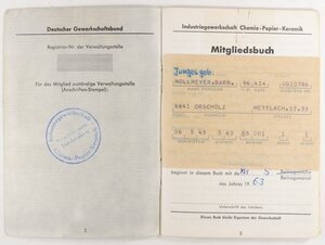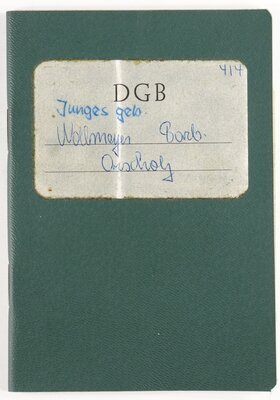 Mitgliedsbuch des Deutschen Gewerkschaftsbundes (DGB). Es wurde im Jahr 1963 für Barbara Junges, geborene Nollmeyer, aus Orscholz ausgestellt. Dem Buch ist zu entnehmen, dass Junges die Mitgliedsbeiträge bis 1968 regelmäßig gezahlt hat. Dies geschah mit speziellen Aufklebern, die in das Buch eingeklebt wurden.