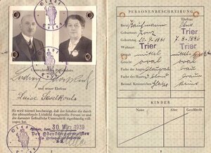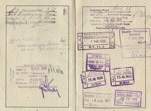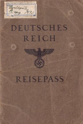 Zu sehen ist ein Reisepass. Zitat Wikipedia: "Das Wort Pass leitet sich vom lateinischstämmigen passare („durchgehen, passieren“) ab. Der französische Ausdruck passeport weist noch deutlicher darauf hin, dass es sich dabei um das „Einlass erhalten bei Pforten/Toren“ handelt (passare portas ‚Tore/Türen durchqueren [dürfen]‘)." Zu jener Zeit war der Inhaber des Passes der Mann. Neben den Personalien und den Fotos sind auch Stempel der verschiedenen Grenzstationen zu finden.