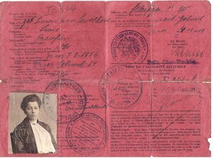 Zu sehen ist der Personalausweis der Frau Luise Savelkouls. Er wurde während der französischen Besatzungszeit 1919 ausgestellt. Neben den Persönlichen Daten und einem Passbild, sondern auch Stempel französischer und deutscher Behörden zu sehen.
