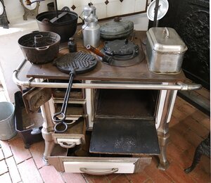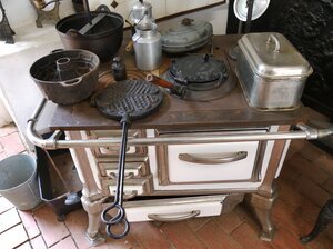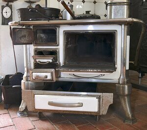 Sparherd der Firma Sieg-Herd-Fabrik GmbH, ein Sparherd, der mehr oder weniger identisch von verschiedenen Herstellern wie z.B. Küpperbusch hergestellt wurde. Der Herd besitzt an der Frontseite 3 Türen - von oben nach unten - zum Schüren, zur Brennkammer und zum Aschefach. Rechts daneben befindet sich ein Ofenrohr und unten zwischen den 4 Füßen eine Schublade zur Aufnahme des Brennguts. Auf der obersten Türe befindet sich die Inschrift Sieg-Meisterherd und unter dem Griff Jos. Braun Hetzerath. Bei letzterem dürfte es sich um den lokalen Händler handeln. Die Klappe in der Mitte bietet die Möglichkeit den Luftzug durch Ausklappen zu regulieren. Die mehrteilige Herdplatte besitzt zwei Aussparungen für Ofenringen oder Kochtöpfe und einen für ein Wasserschiff. Der Griff zur Regulierung der Abluft fehlt. Der Hersteller wurde 1896 als Siegerländer Herdfabrik in Geisweid (ein nördlicher Stadtteil von Siegen), gegründet. 1927 erfolgte die Umfirmierung in Sieg-Herd-Fabrik. 1964 erfolgt der Umzug des Unternehmens nach Buschhütten bei Kreuztal (etwas nördlich von Siegen). 1976 wird Sieger eine Tochtergesellschaft der Buderus AG und kommt mit diesem 2003 zum Bosch-Konzern. 2011 fusionierten innerhalb des Bosch-Konzerns die Unternehmensteile Sieger und Junkers und die Produkte wurden fortan unter dem Namen Junkers vertrieben. 2019 wurde dieser Markenname aufgegeben und die Produkte werden seither unter dem Namen Bosch angeboten. Sparherd allgemein: Ein Sparherd (auch als Küchenhexe, Stangenofen oder Stangenherd bezeichnet) ist ein meist mit Brennholz befeuerter Herd und wurden vom Ende des 18. Jh bis in die 1960er-Jahre gebaut und benutzt. Danach wurden sie immer mehr von Gas- und Elektroherden verdrängt. Im Vergleich zu den bis dahin üblichen Herdfeuerungen mit Rauchmantel und damit der Umgang mit offenem Feuer im Haushalt waren sie ein großer Fortschritt. Mit ihnen konnte der Energieverbrauch beim Kochen und Braten reduziert werden. Die Küchen waren rauchfrei und konnten so auch als Wohnraum genutzt werden. Sparherde besitzen eine Abdeckplatte aus Gusseisen mit mehreren runden Öffnungen die normalerweise mit kreisrunden Herdringen verschlossen werden und dazu dienen Töpfe, Pfannen, Kaffeeröster etc. direkt in das Feuer einhängen zu können. Die innerste Kreisscheibe kann mittels eines Schürhakens entfernt werden. Eine rechteckige Aussparung in der Herdplatte war für ein Wasserschiff vorgesehen. Sparherde wurden auch für Kochwäsche benutzt. Sie besitzen fast immer auch ein Bratrohr. Sparherde besitzen außen einen Mantel aus dünnen Eisenblechen, die zum Schutz vor Korrosion emailliert sind. Seit Beginn des 20. Jahrhunderts wurden die Herdflanken weiß emailliert, um die neue Sauberkeit der Küche zu unterstreichen.