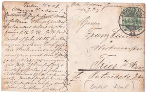 Die Ansichtskarte zeigt ein Gruppenfoto etlicher Soldaten stehend oder knieend vor einer Bretterwand. Sie gruppieren sich um einen großen Schneemann, der eine Soldatenmütze und einen Schnurbart trägt. Zwei Soldaten halten in der Mitte ein Schild mit der Aufschrift "Ein Winter 1908 in Döberitz". Die Karte wurde von Karl Simon an seine Familie in Trier geschickt. Er war im Verlauf seines Wehrdienstes auch auf dem Truppenübungsplatz Döberitz stationiert. Erst ab 1905 war die Vorderseite einer Postkarte geteilt. Rechts die Adresse mit Briefbarke, links die Möglichkeit, persönliche Nachrichten zu verfassen.