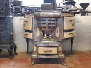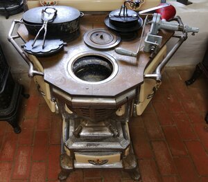Feu triangulaire flamand - Dreieckiges flämisches Feuer - ist ein dreieckiger Küchenherd, der vor allem in Nordfrankreich und in Belgien beliebt war. Er eignet sich zu allererst für das regionale Gericht Patacons. Für diese schneidet man Kartoffeln und Zwiebeln in große Stücke und gibt diese schichtweise in eine gefettete Auflaufform. Danach werden sie im Rohr gegart. Der eigentliche Ofen befindet sich an der Spitze des Herds. Mit Brenngut versorgt wird der Ofen von oben, d.h. von der Herdplatte aus. Ganz unten ist die Ascheschublade. An beiden Seiten des Herds befinden sich Türen zu einem Ofenrohr. Die mehrteilige Herdplatte hat drei Aussparungen für Ofenringe/Töpfe.
