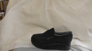 Eine Einzelne Herren-Sandale aus Stoff und Holz. Der Schuh hat eine Spitze Form und zwei Absätze, einen vorne (4,5 cm) und einen hinten (4,5 cm). Er verfügt über eine Stoffbandage über dem Schuhblatt, welche mit Perlmutt- und Metall-Intarsien und Pailletten bestickt ist. Hergestellt in Tunesien, in Mitte des 19. Jahrhunderts.