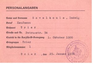 Zu sehen ist eine Ausweiskarte deutsche Stenografenschaft, ausgestellt 1934 für den Herrn Ludwig Savelkouls. Neben dem Passfoto und persönlichen Angaben, finden sich auch Stempel der ausstellenden Behörde. Auf der Rückseite stehen noch einige rechtliche Hinweise. Auf dem Titelblatt ist als Logo des Vereins ein geflügelter Stift mit Hakenkreuz zentral eingestellt.