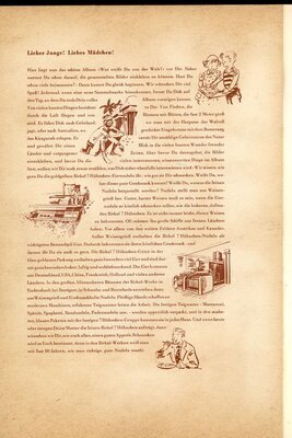 Die Firma Birkel, Nudelfabrik aus Endersbach/Stuttgart war Mitte der 1980er Jahre in den Nudelskandal verwickelt. Die Umsatzeinbrüche waren enorm, so dass die Danone Gruppe die Firma übernahm. Seit den späten 1950er Jahren packte Birkel seinen Nudelpackungen Sammelbilder bei. 1966 erschien das Sammelalbum „Was weißt Du von der Welt“. Auf 63 Seiten werden die unterschiedlichsten Themen behandelt, die durch 120 gezackte Bilder –ähnlich einer Briefmarke- ergänzt sind. Die Themen reichen von Entdeckungen, Urwelt, fremde Völker bis hin zu Verhr und Technik.