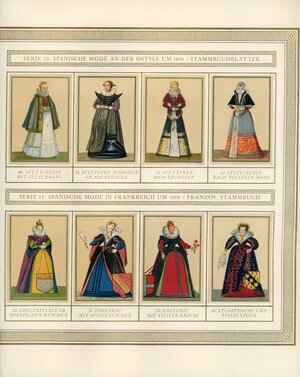 Sammelbilder waren vor und nach dem 2. Weltkrieg beliebte Sammelobjekte. Das wurde sie von vielen namhaften Unternehmen genutzt. Dazu gehörten Firmen wie Reemtsma, Haus Neuerburg, Birkel, Stollwerck oder auch Margarine Union oder Kölln Haferflocken. Die Bilder wurden den Packungen beigelegt, die dazugehörigen Alben konnten käuflich erworben werden. Unser Sammelalbum wurde von der Zigarettenfabrik Haus Neuerburg in Köln herausgegeben. Die eingeklebten Bilder umfassen den Bereich Mode aus vier Jahrhunderten. Spanische Mode in Deutschland, Italien, Frankreich oder der Ostsee. Mode zur Zeit des 30jährigen Krieges, Zur Zeit Ludwig XIV, des Rokoko bis hin zu 1900 Auf 48 Seiten finden sich 280 Bilder womit das Album komplett bestückt ist.