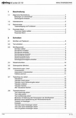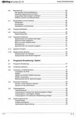 Der Einband der Betriebsanleitung ist mehrfarbig gedruckt. Die insgesamt 164 Seiten umfassende deutsch-englische Betriebsanleitung enthält umfangreiche Informationen zum Gebrauch des NC-scribers CS 110 mit zahlreiche schwarz-weiß Graphiken und viele Hinweisen zu Schriften. Daneben gibt es ein Beiblatt Software und Zubehör mit Hinweisen auf Cassetten. Über den eingebauten Cassetten Schacht kann der NC-scriber mit weiteren Modulen ergänzt werden. Auf der Memory-Cassette kann der 16 k-Byte Speicherinhalt des NC-scriber gesichert werden. Außerdem sind Symbol-Cassetten für 8 unterschiedliche Branchen erhältlich. Neben 7 festeingebauten Schriften stehen viele weitere Schriften über Schriftart-Cassetten zur Verfügung. Ein Eigenprogrammier-Modul kann für eine eigene Symbolbibliothek genutzt werden. Diese Symbole lassen sich über einige einfache Tastenbefehle programmieren. Die Tastenbefehle sind in der Betriebsableitung erläutert.