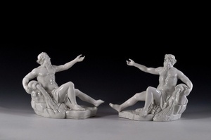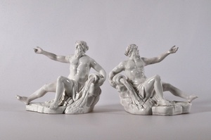 Zwei Flußgötter, als zusammegehöriges Paar symmetrisch angelegt. Der bärtige Flußgott sitzt an einem Felsen,und hält mit einem Arm einen überlaufenden Wasserbehälter, der andere Arm ist erhoben, als ob er in die Ferne deuten wolle (oder auf sein ihm gegenüberliegendes Pendant verweist). Solche Figuren waren in der Barockzeit wei verbreitet. Viele brunnenanlagen verwenden als Eifassung oder als Rahmen vergleichbare Motive. Das Motiv selbst geht auf Fons zurück, dem römischen Quellengott. Fons, auch Fontus oder Fontanus, ist einer der zahlreichen "kleinen" Götter der römischen Mythologie. Er ist der Gott der Quellen, Brunnen und fließenden Gewässer. Sein Fest, genannt Fontanalia, wurde am 13. Oktober gefeiert. An seinem Fest wurden Brunnen und Quellen mit Blumen geschmückt. Bezeichnung unter dem Boden: eingeritzt "L" "I"