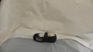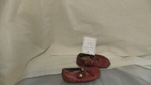 Ein Paar Schwarze Kinder-Spangenschuhe aus Leder. Die Schuhe haben eine Runde Form und einen metallgenagelten Blockabsatz von 1 cm. Sie verfügen über eine Spange mit Knopfverschluss. Datiert auf um 1930.