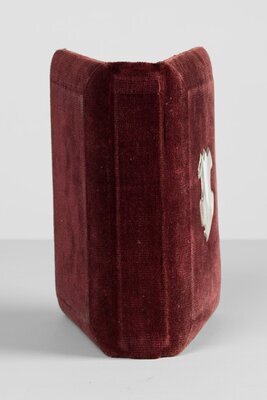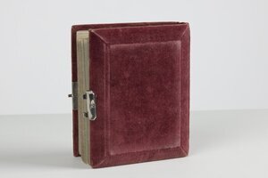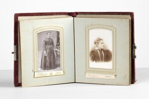 Ein fast quadratisches Fotoalbum mit rotem Samt bezogen und Metallverschluss. Das Album besteht aus 9 Seiten, die aus sehr festem, 2 mm starkem Karton bestehen. Beiderseits sind Passepartout eingearbeitet, die zur Aufnahme fotografischen Visitenkarten, auch Cartes de Visite genannt vorbereitet sind. Auf dem vorderen Deckel ist ein Wappenschildaus glänzendem Metall angebracht. Die eingesteckten Fotos haben größtenteils eine Größe von 103 x 63 mm.