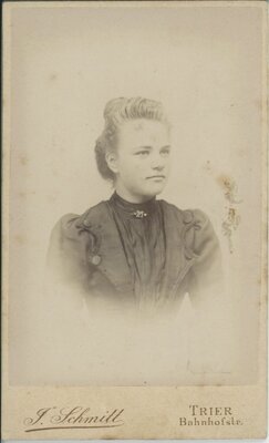 Brustportrait einer jungen Dame mit hochgestecktem welligen Haaren. Sichtbar ist ein dunkles Oberteil mit Puffärmeln und geschwungenem Revers. Am Hals trägt sie eine Brosche. Dreiviertel-Profil mit Blickrichtung rechts aus dem Bild. Am unteren Bildrand der Name des Fotografen: J. Schmitt Trier Bahnhofstr. Die Rückseite ist bedruckt mit Werbung für das eigene Atelier, einem Blumenstrauss und dem Hinweis: "Die Platte bleibt für Nachbestellungen aufbewahrt. Vergrösserungen nach jedem Bilde bis Lebensgrösse in künstlerischer Ausfertigung"