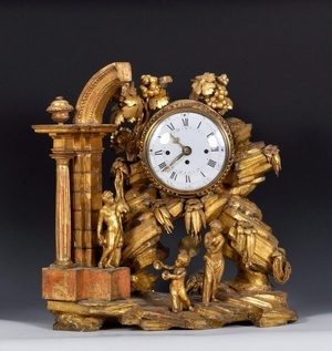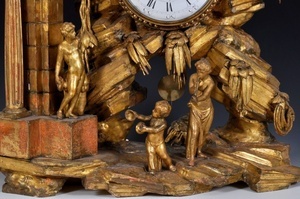 Die Uhr wird von einer Grotte getragen. In dieser höhlenartigen Landschaft steht Dionysos unter einem Architekturfragment. Nymphen und Putti neigen sich ihm huldigend entgegen. Das Motiv illustriert die Gattung der Schäfergedichte, die ein freizügiges Ideal des Landlebens von Hirten und Schäferinnen in anmutiger Landschaft als „Arkadien“ oder „goldenes Zeitalter“ beschrieben. Die Uhr hat ein weißes Emailzifferblatt mit schwarzen arabischen Zahlen, Datumsanzeige und durchbrochen gearbeiteten Zeigern. Das Uhrwerk besitzt drei Gangwerke: Minutenschlagwerk, Stundenschlagwerk, Datumsanzeige. Zusätzlich ein Schlagwerk für volle Stunden und jede Viertelstunde.