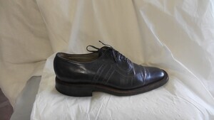 Ein Paar Schwarze Herren-Halbschuhe aus Leder. Eckige Form, Schuhgröße 6. Die Schuhe haben einen metallgenagelten Blockabsatz (2 cm). Sie verfügen über eine Schnürung mit Ösen an der Innenseite und über Ziernähte. Zudem ist auf den Schuhen ein Sohlenstempel : "Feinste Rahmenarbeit-deutsche Wertarbeit". Es handelt sich hierbei um ein Blattschnitt mit aufgesetzter Kappe. Hergestellt für die Marke "Lux". Datiert auf 1936.