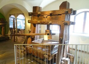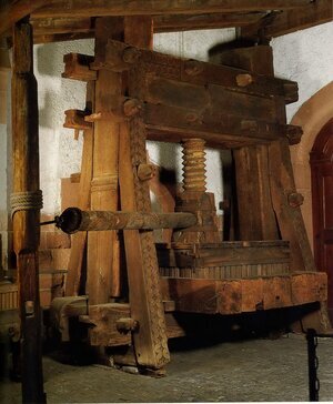 Einspindelkelter. Seitenpfosten mit abgefassten Kanten. Alles übrige ohne Zier. Altes und seltenes Exemplar der seit dem frühen Mittelalter in der Pfalz weit verbreiteten Form der Weinpresse in Form der Holzspindelkelter mit horizontalem Druckwerk und zentraler Spindel. Keltern wie diese waren in der Pfalz bis zum Ende des neunzehnten Jahrhunderts verbreitet, einzelne Exemplare blieben in modernisierter Version gar bis in die 1950er Jahre in Gebrauch. Der Bietkasten, in den die Trauben zum Pressen aufgeschüttet wurden, fehlt. Besitzerinschriften: “Seibell”, “Held” und “Bruch”. Gegenüber den Baumkeltern zeichneten sich die Holzspindelkeltern durch geringeren Platzbedarf und wesentlich einfachere Bedienung aus. Hier wurden die Trauben, die zuvor durch das Zerstampfen mit dem Mostkolben oder das Quetschen mit der Traubenmühle in ihrem Volumen bereits reduziert waren, in den ringsum durch Bretter (Setzdielen oder Seckerbretter) erhöhten Kelterkasten (Biet) geschüttet. Das Lesegut deckte man mit entsprechenden Legedielen ab, auf die wiederum einige Kanthölzer (Bracken) aufgesetzt wurden. Zum Schluss legte man einen breiten, schweren Eichenklotz auf (die Pfanne), auf den auch der eigentliche Pressdruck unmittelbar ausgeübt wurde. Holzspindelkeltern waren Oberdruckkeltern; der Pressdruck wurde also immer von oben auf das Pressgut im Bietkasten ausgeübt. Den Spindeldruck konnte man durch Drehen der Spindel erhöhen. Bis der Anpressdruck erreicht war, wurde die Spindel direkt gedreht; dann verband man den Spindelhebel mit dem sogenannten Haspelbaum, der eine weitere Druckerhöhung ermöglichte und ein Zurückschnellen der Spindel verhindern half. An der Vorderseite des Bietkastens floss der Most,. der "Süße", wie er in der Pfalz heißt, durch ein oder zwei Öffnungen in die darunter gestellte Bütte. In Abständen wurde nachgedrückt und die Trauben so schließlich zu einem festen Trester gepresst. Den Trester zerschnitt man mit einem Tresterbeil, wendete und ließ weitere Pressvorgänge folgen. Holzspindelkeltern wie diese waren bis zum Ende des 19. Jahrhunderts in der Pfalz noch weit verbreitet. [Ludger Tekampe]