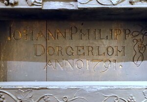 Stammt, zusammen mit HM_0_00650, aus dem Keller des Fürstprimas Frhr. von Dalberg, Grossherzog v. Frankfurt, des Schlosses Kesselstadt bei Hanau. Um 1800 in Burckschem Besitz. Obere Bodenhälfte mit Monogrammschild von 2 Löwen gehalten. Inschrift dem Fassrand entlang: "WILHELM IX LANDGRAF ZU HESSEN GRAF ZU HANAU 1791". Weitere Inschrift mit dem Namen des Herstellers: "JOHANN PHILLIPP DORGERLOH 1791". Riegel ziemlich vollrund als Wassergott u. Nixe, verschlungen. Fassschraube in Messing. Fassungsvermögen 5812 Liter. Aichstempel. 12 Eisenreifen. Geziert mit dem persönlichen Monogrammwappen von Wilhelm IX. Landgraf zu Hessen Graf zu Hanau. Wilhelm IX. wurde 1743 als Sohn des Landgrafen Friedrich II. in Kassel geboren. 1764 übernahm er die Regentschaft in der Grafschaft Hanau-Münzenberg. 1785 wurde er Landgraf von Hessen-Kassel. Mit dem Reichsdeputationshauptschluss 1803 erhielt Wilhelm IX. die Kurwürde als Entschädigung für den Verlust der linksrheinischen Gebiete. 1806 ging Wilhelm wegen der Besetzung Hessen-Kassels durch die Franzosen ins Exil und kehrte erst 1813 nach Kurhessen zurück.