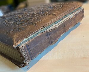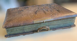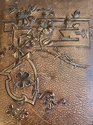 Ein Album mit dunkelbraunem Leder eingebunden. Das Innere besteht aus vierzehn Seiten starker Pappe. In diese Pappe sind größere und kleinere Passepartouts für die Bilder gestanzt, diese können von unten eingeschoben werden. Auf der Vorderseite sind erhaben Knospen und Blüten dargestellt. An einer Schleife hängt ein Schild mit einem Glücksklee aus Wappen herunter. Das Ganze macht einen fröhlichen, fast verspielten Eindruck. Das Album wird von einer noch intakten Schließe verschlossen. Auf der Rückseite bildet der Buchstabe "H" ein Muster.