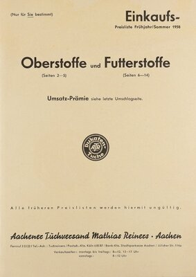 Eine Preisliste für Oberstoffe und Futterstoffe aus dem Frühjahr und Sommer 1958. Darin sind die Preise aufgelistet, die Zwischenhändler für verschiedene Waren beim Aachener Tuchversand Mathias Reiners zahlen mussten. Neben den Bestellnummern der einzelnen Artikel ist der entsprechende Preis aufgelistet. Dieser nimmt bei großen Mengen deutlich ab. Der Grund dafür ist, dass die Preisliste für einen Großabnehmer bestimmt war. Dafür spricht auch, dass dort nur die Einkaufs- und nicht die endgültigen Verkaufspreise aufgelistet sind. Außerdem befindet sich darin ein Schreiben des Aachener Tuchversandes an eine Mathilde Schmidt aus Wasserlisch, in der es um die Lieferung von Schnittmustern geht. Des weiteren liegt dem Heft auch eine Prämienkarte von Frau Schmidt bei.