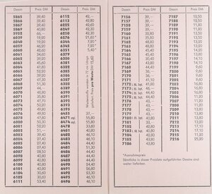 Preisliste aus dem Winter 1957 und 1958. Darin sind die Preise aufgelistet, die für verschiedene „Dessins“ gezahlt werden mussten. Neben den „Dessins“-Nummern der einzelnen Artikel ist der entsprechende Preis aufgelistet. Von wem genau die Liste stammt, ist nirgendwo vermerkt, sie weist jedoch starke Ähnlichkeit mit einer Einkaufs-Preisliste aus dem Winter 1957 und 1958 der Firma Lehmann & Schmidt aus Düsseldorf auf. Entsprechend kann man davon ausgehen, dass es wohl eine Preisliste der Verkaufspreis der Firma ist. Dafür würde auch sprechen, dass die jeweiligen Preise der einzelnen Dessins“-Nummern etwa 20 % höher als der Einkaufspreis ist. Und 20 % war in den 50.ern der durchschnittliche Aufschlag den viele Händler auf den Einkaufspreis dazurechneten.