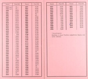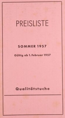 Preisliste aus dem Sommer 1957. Darin sind die Preise aufgelistet, die für verschiedene „Dessins“ gezahlt werden mussten. Neben den „Dessins“-Nummern der einzelnen Artikel ist der entsprechende Preis aufgelistet. Von wem genau die Liste stammt, ist nirgendwo vermerkt, sie weist jedoch starke Ähnlichkeit mit einer Einkaufs-Preisliste aus dem Winter 1957 und 1958 der Firma Lehmann & Schmidt aus Düsseldorf auf. Entsprechend kann man davon ausgehen, dass es wohl eine Preisliste der Verkaufspreis der Firma ist. Dafür würde auch sprechen, dass die Preise der einiger Dessins“-Nummern etwa 20 % höher als der Einkaufspreis ist. Und 20 % war in den 50.ern der durchschnittliche Aufschlag den viele Händler auf den Einkaufspreis dazurechneten.
