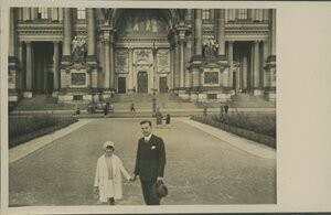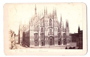 Zu sehen ist das Hauptportal des Mailänder Doms von Nordwesten aus fotografiert. Unten sind ein großes Hauptportal, sowie vier Nebenportale zu sehen. Die dreischiffige Kirche hat unten zwei Fenster vor jedem Seiten- und drei, etwas erhöht, vor den drei Kirchenschiffen. An der Fassade der Kathedrale kleinere und größere Doppeltürme. Etwa in der Mitte des Bauwerkes ragt ein großer Vierungsturm heraus. Vor dem Dom und rechts befinden sich freie Plätze. Links verläuft eine breitere Straße mit Geschäften.