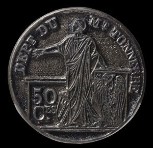 Ein Stempel des Départements du Mont-Tonnerre für Gebühren in Höhe von 50 Centimes. Das Stempelbild zeigt eine männliche Gestalt, die mit einer Toga nach Vorbild des Gewandes des freien römischen Bürgers bekleidet ist. Die rechte Hand ist auf einem Sockel mit einem Adler gestützt. Zu den Füßen der Figur lehnt ein Ruder, auf dem ein Dreizack abgebildet ist. Der Adler verweist als Wappentier Frankreichs unter Napoleon auf die Zugehörigkeit des Départements zu Frankreich. Das Ruder verweist wahrscheinlich auf den Rhein als schiffbaren Fluss. Der Rhein markierte die östliche Grenze des Départements. Im Zuge der französischen Revolutionskriege wurden die von den Franzosen annektierten Gebiete in Verwaltungseinheiten nach französischem Vorbild geschaffen. Auf dem linksrheinischen Gebiet des heutigen Bundeslandes Rheinland-Pfalz entstanden das Département du Mont-Tonnerre, das Département de la Sarre und das Département de Rhin-et-Moselle. Der Rückgriff auf antike Motive ist typisch für die Zeit um 1800 und die Stilrichtung des Klassizismus bzw. im Besonderen für den Empire-Stil unter Napoleon. Gerade bei offiziellen Bildwerken bzw. im öffentlichen Bereich genutzten Bildmotiven hatte die Antikenrezeption vor allem auch politischen Charakter. Sie implizierte den Anspruch einer Wiederbelebung des römischen Imperiums durch das Frankreich unter Napoleon. [Johanna Kätzel]