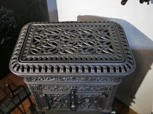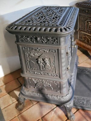 Einstöckiger Margarethenofen, aufgrund seines Herstellers auch Vogesenofen genannt. Er ist mit Schmuckelementen überzogen. Im Bratrohr und ganz oben in der Deckplatte befinden sich Ringe im Boden. Diese können herausgenommen werden um Töpfe zu Kochen, bzw. zum Warmhalten von Speisen in das Loch stecken zu können. Dazu wird Teil der Luft aussen um das untere Stockwerk herumgeführt. Der Ofen wird von der rechten Seite aus beheizt. Die Türe zur Brennkammer besitzt eine Regulierschraube. Über dieser die Beschriftung no 1. Unter der Brennkammer hängt zwischen den Löwenfüßen eine Halterung zur Aufnahme der Aschenschale. Die Frontseite ist überwiegend mit floralen Elementen geschmückt. Die zweiflüglige Tür ist mit je einem männlichen und einem weiblichen Portrait geschmückt. Die beiden Seitenwände sind mit je einer Gussplatte geschmückt. Diese zeigen einen jungen Mann und eine junge Frau. Unter den Türen befindet sich zwischen ornamentalem Schuck die Herstellerangabe: DE DIETRICH & G.NIEDERBRONN . Neben traditionellen Produkten baute dieses Unternehmen um 1900 an seinem Stammsitz in Niederbronneim Elsaß auch Automobile.