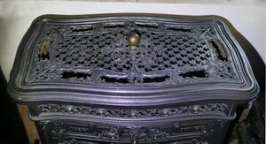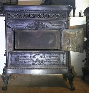 Einstöckiger Margarethenofen, aufgrund seines Herstellers auch Vogesenofen genannt. Er ist mit Schmuckelementen überzogen. Im Bratrohr und ganz oben in der Deckplatte befinden sich Ringe im Boden. Diese können herausgenommen werden um Töpfe zu Kochen, bzw. zum Warmhalten von Speisen in das Loch stecken zu können. Dazu wird Teil der Luft aussen um das untere Stockwerk herumgeführt. Der Ofen wird von der linken Seite aus beheizt. DIe Brennkammer ist mit Schamotte ausgekleidet. Die Türe zur Brennkammer besitzt eine Regulierschraube. Unter der Brennkammer hängt zwischen den mit Engelsköpfen verzierten Füßen eine Halterung zur Aufnahme der Aschenschale. Die Frontseite ist überwiegend mit rankenartigen Elementen mit Engelsköpfen geschmückt. Die zweiflüglige Tür zeigt Bilder von Burgruinen. Die beiden Seitenwände sind mit je einer Gussplatte versehen. SIe zeigen Bilder von Burgen. Über den Türen befindet sich die Inschrift "VOGESEN OFEN No 259. Zwischen den beiden Wörtern befindet sich ein Harlekinskopf. Unter den Türen befindet sich zwischen ornamentalem Schuck die Herstellerangabe: DE DIETRICH & C .NIEDERBRONN . Neben traditionellen Produkten baute dieses Unternehmen um 1900 an seinem Stammsitz in Niederbronneim Elsaß auch Automobile.
