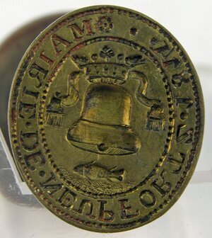 Amtliches Siegel der Bürgermeisterei ("Mairie") Neupfortz (auch Neupfotz, seit 1935 Neupotz, Ortsgemeinde im Landkreis Germersheim in Rheinland-Pfalz) mit ovaler Siegelplatte und gedrechseltem Holzgriff mit pilzförmigen Ende. Das Stempelsiegel stammt aus napoleonischer Zeit. In der Folge der französischen Revolutionskriege und der Annektierung exterritorialer Gebiete durch die Franzosen, wurden die dort vorherrschenden Verwaltungsstrukturen zerschlagen. Die neue Gliederung erfolgte nach französischem Vorbild mit Mairie, Kanton, Arrondissement und Département. Neupfortz war zu dieser Zeit verwaltungstechnisch der Mairie Leimersheim zugeteilt, die zum Kanton Germersheim im Arrondissement Speyer gehörte. Dieses gehörte wiederum zum Département du Mont-Tonnerre. Die Ikonographie amtlicher Siegel in diesen Verwaltungsgebieten weist zwar häufig sehr deutlich auf die Zugehörigkeit zum französischen Staatsgebiet hin. Hier sind es aber nur die französische Sprache und die Bezeichnung des Bürgermeisteramtes als "Mairie". Das Siegelbild der Glocke mit dem Fisch darunter bezieht sich dagegen auf eine lokale Sage und geht auf ein Gerichtssiegel von 1724 zurück. [Johanna Kätzel]