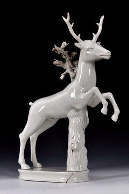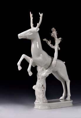Um 1830 ist Johann Dielmann-Schramm der Fabrikleiter der Steingut- und Fayencefabrik Mainz. Laut einer Familienlegende besuchte er vor 1830 Paris. Dort beeindruckten ihn die Museen mit ihren Kunstsammlungen. Sie inspirierten ihn zum Entwurf einer großen Figurengruppe, einer „Diana mit Hirsch“. Der Louvre besitzt tatsächlich eine solche Marmorgruppe aus dem 2. Jahrhundert. Nach seiner Rückkehr hatte Schramm dann diesen Hirsch modelliert, allerdings ohne Diana, an deren Gestaltung er sich nicht wagte. Für die Familienüberlieferung spricht, dass dieser Hirsch tatsächlich dem genannten Vorbild im Louvre ähnelt. Es handelt sich bei dem Hirsch wahrscheinlich um ein Einzelstück, das aus dem Besitz der Familie ins Museum gelangte. Die Keramik ist unter dem Boden mit der Pressmarke "MAINZ" bezeichnet. - - - Daten zu der Steingut- und Fayencefabrik Mainz: Gründer ist Departementsbuchducker Carl Friedrich Pfeiffer. 1818-1825: Darmstädter Hofrat Reuling 1825: Reulingsche Fayencefabrik u. Buchdruckerei, Dir. W. Seifert 1833: Anwesen geh. "den Hospiten", Ltg. Joh. Dielmann Schramm 1839: Porzellan-Fabrik Hospitien Bezeichnung unter dem Boden: Preßmarke: "Mainz"