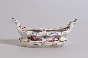 Surtout (Essig & Öl) mit Purpurdekor, bunten Blumen und Insekten Höchster Porzellanmanufaktur um 1765 Bezeichnung unter dem Boden: jeweils: blaue Kurhutmarke, Preßzeichen "I H"