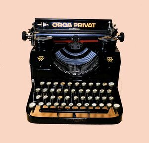 Ab 1922 baute die Fa. Bing auch Schreibmaschinen, zunächst die "Orga Standard" ab 1923 die Orga Privat. Das Unternehmen beschäftigte in dieser Blütezeit rund 16.000 MitarbeitenAlle Modelle zusammengefasst wurde die Orga Privat über fast 30 Jahre produziert. Mit dem Produktionsende 1953 endet auch die Geschichte der Orga Privat. (s. Quellenangabe) Unsere Orga Privat, Modell 4, wurde 1927/1928 hergestellt und trägt die Produktionsnummer 114.734. Auf dem schwarzen, glänzenden Lack prangt in großen, goldfarbenen Buchstaben der Name: ORGA PRIVAT – Bing Werke sowie das Firmen Logo. Die „Volksschreibmaschine, wie sie auch genannt wurde, hat einen harten Anschlag und verfügt über eine reichhaltige Ausstattung. Dazu gehört. Wagenfreilauf, Randsteller rechts, Feststeller für Umschaltung, Rücktaste und staubdicht geschlossene Farbbandspulen. Die Spulen haben einen kleineren Durchmesser, das Farbband eine Breite von 14 mm. Beides sind keine Standardwerte. Die Orga wird von einer schwarzen Blechgaube geschützt, auf der ebenfalls in goldfarbenen Buchstaben der Name „Orga Privat“ steht. Technisch gesehen ist es eine Typenhebelmaschine mit Wagnergetriebe und Wagenumschaltung.