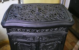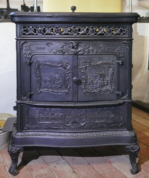 Der Ofen wird von der linken Seite aus beheizt. DIe Brennkammer ist mit Schamotte ausgekleidet. Die Türe zur Brennkammer besitzt eine Regulierschraube. Unter der Brennkammer hängt zwischen den mit Engelsköpfen verzierten Füßen eine Halterung zur Aufnahme der Aschenschale. Die Frontseite ist überwiegend mit rankenartigen Elementen mit Engelsköpfen geschmückt. Die zweiflüglige Tür zeigt Bilden von Burgruinen. Die beiden Seitenwände sind mit je einer Gussplatte versehen. SIe zeigen Bilder von Burgen. Über den Türen befindet sich die Inschrift "No 259 LE VOGESEN". Zwischen den beiden Wörtern befindet sich ein Harlekinskopf. Unter den Türen befindet sich zwischen ornamentalem Schuck die Herstellerangabe: DE DIETRICH
