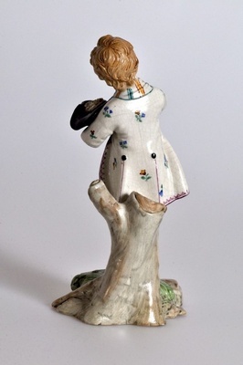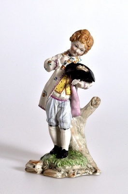 Auf einem Grassockel steht ein Knabe vor einem Baumstumpf. Mit der rechten Hand weist er auf ein Vogelnest mit jungen Vögeln, das sich in dem Hut befindet, den er mit seinem linken Unterarm hält. Er ist mit einem Hemd, Kniehosen und einem Gehrock bekleidet und trägt ein geknotetes Halstuch. Die Modellierung des Gesichts, die bewegte Körperhaltung und der weisende Finger sind Merkmale des Bildhauers und Modelleurmeisters Johann Peter Melchior (1747 - 1825). Vorbild für den Knaben ist der Kupferstich "Knabe mit Vogelnest" von Gottlieb Leberecht Crusius aus der Folge der "Cappriccij, première partie" (Leipzig 1766). Dieses Knabenmotiv traf offensichtlich auch den bürgerlichen Geschmack des 19. Jahrhunderts. Die 1827 gegründete Steingutfabrik in Damm bei Aschaffenburg erwarb die Formmodelle der Höchster Porzellanmanufaktur und produzierte bis zu ihrer Schließung im Jahre 1884 zahlreiche Höchster Modelle in Steingut nach, so auch diese Figur. Bezeichnung unter dem Boden: blaue Radmarke, blaues "D"