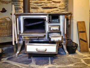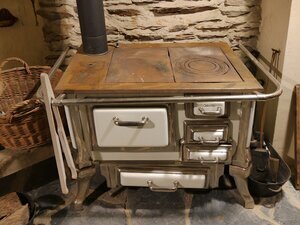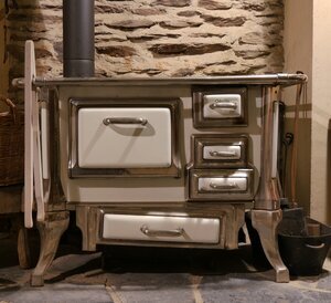 Freilichtmuseum Roscheider Hof- Der Sparherd der Firma Osterflüs besitzt ein Bratrohr. Rechts davon befidet sich die Feuerungsanlage. Letztere besteht von oben nach unten aus einer Tür zum Füllen das Ofens, darunter einer Tür zur Brennkammer und unter dieser eine Schublade zur Aufnahme der Asche. An der obersten Tür befindet sich die Aufschrift "Osterflüs". Unten am Ofen hängt eine Schublade zur Aufnahme des Brennguts. Die Ofenplatte besitzt je eine Aussparung zur Aufnahme eines Wasserschiffs und von Ofenringen. Der Ofen steht auf 4 Füßen. Rechts neben dem Rauchabzug ist ein Griff zur Regulierung von diesem. Hersteller: Osterflüs in Menden (Sauerland) Sparherd allgemein: Ein Sparherd (auch als Küchenhexe, Stangenofen oder Stangenherd bezeichnet) ist ein meist mit Brennholz befeuerter Herd und wurden vom Ende des 18. Jh bis in die 1960er-Jahre gebaut und benutzt. Danach wurden sie immer mehr von Gas- und Elektroherden verdrängt. Im Vergleich zu den bis dahin üblichen Herdfeuerungen mit Rauchmantel und damit der Umgang mit offenem Feuer im Haushalt waren sie ein großer Fortschritt. Mit ihnen konnte der Energieverbrauch beim Kochen und Braten reduziert werden. Die Küchen waren rauchfrei und konnten so auch als Wohnraum genutzt werden. Sparherde besitzen eine Abdeckplatte aus Gusseisen mit mehreren runden Öffnungen die normalerweise mit kreisrunden Herdringen verschlossen werden und dazu dienen Töpfe, Pfannen, Kaffeeröster etc. direkt in das Feuer einhängen zu können. Die innerste Kreisscheibe kann mittels eines Schürhakens entfernt werden. Eine rechteckige Aussparung in der Herdplatte war für ein Wasserschiff vorgesehen. Sparherde wurden auch für Kochwäsche benutzt. Sie besitzen fast immer auch ein Bratrohr. Sparherde besitzen außen einen Mantel aus dünnen Eisenblechen, die zum Schutz vor Korrosion emailliert sind. Seit Beginn des 20. Jahrhunderts wurden die Herdflanken weiß emailliert, um die neue Sauberkeit der Küche zu unterstreichen.