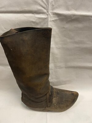 Ein Einzelner Schwarzer Herren-Schnürschuh aus Leder. Der Schuh hat eine Runde Form und einen metallgenagelten Blockabsatz (1,5 cm). Er verfügt über eine Ösen- und Hakenschnürung, die Sohle ist genagelt und an der Spitze ist ein separates Stück Leder angenäht.