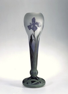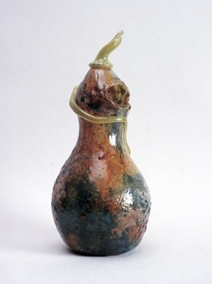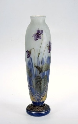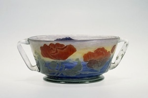 Farbloses Glas mit flockigen Pulveraufschmelzungen aus rotbraunem und gelbem Glas. Der Dekor, die Winterlandschaft, besteht aus braunem Überfangglas, das bis auf die Bäume im Vordergrund abgeätzt wurde. Die Details, der Hintergrund und der Boden sind als opake Emaillemalerei ausgeführt. Auf der Wandung bezeichnet: DAUM NANCY mit Lothringer Kreuz. Bezeichnung auf der Wandung: DAUM NANCY mit Lothringer Kreuz
