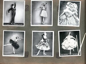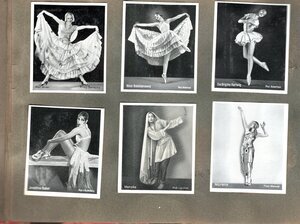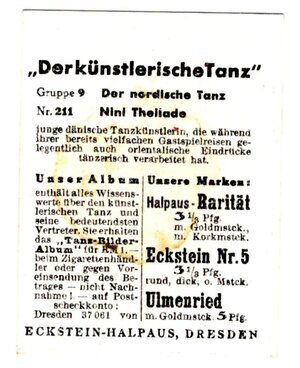 Ein privates Fotoalbum gefüllt mit Zigarettenbildern "Der künstlerische Tanz". Auf 30 Seiten hat der frühere Besitzer(in) Bilder bedeutender Tänzer(innen) gesammelt und eingeklebt. Darunter sind Namen wie Mary Wigmann (1986-1973), Anna Pawlowa (1881-1931), Alexander Sacharoff (1886-1963) Josefine Baker (1906-1975) und Andere. Herausgegeben wurden die s/w Bilder (6 x 6 cm) von der Zigarettenfabrik Eckstein-Halphaus aus Dresden. Auf der Rückseite jeden Bildchens sind Informationen über die Sammlung, den Künstler(in) selbst, sowie Eigenwerbung der Zigarettenmarken "Halphaus Rarität", "Eckstein Nr. 5" und "Ulmenried" Das Fotoalbum hat mit den Zigarettenbildern eine Zweitnutzung erfahren. Ursprünglich diente es als Familien Fotoalbum, wovon die handschriftlichen Erlärungen zeugen.